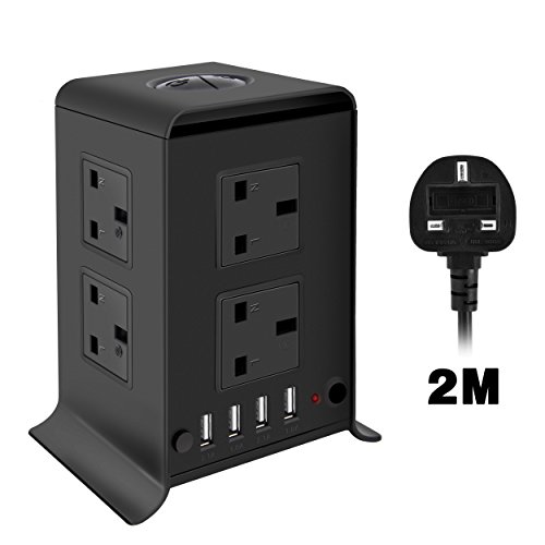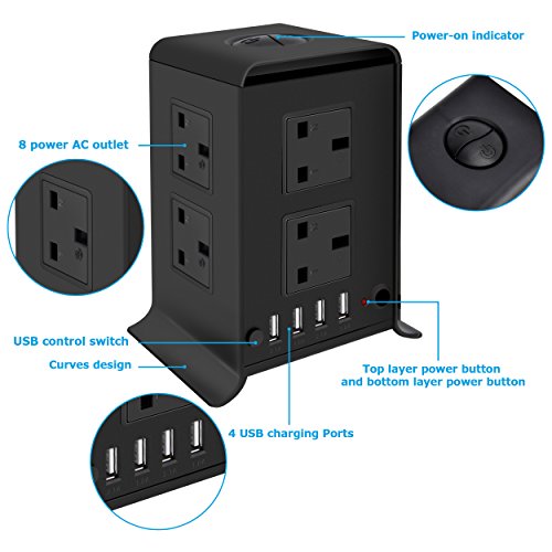 Tower Extension Lead with USB Slots 5M Multi Plug Extension 8 Outlets and 4 USB (1 Type C & 3